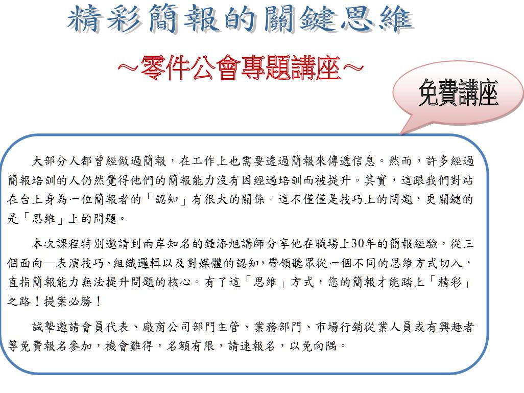 台北市電子零件公會2017年3月份專題講座將於3月7日下午舉辦,本次特別邀請鍾添旭老師分享“精彩簡報的關鍵思維”,誠摯邀請會員代表、公司部門主管、業務、市場行銷從業人員或有興趣者等免費報名參加,機會難得,名額有限,請速報名,以免向隅!