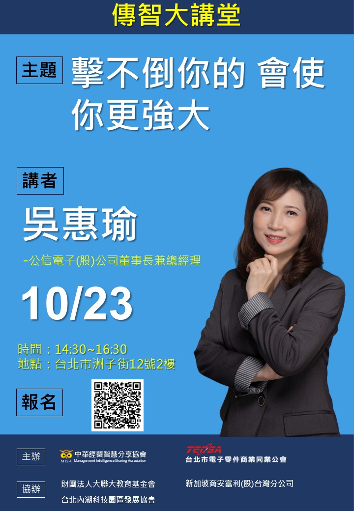 傳智大講堂特別邀請吳惠瑜董事長,以「擊不倒你的會使你更強大」為題,分享其精彩的人生歷程與職場智慧。
