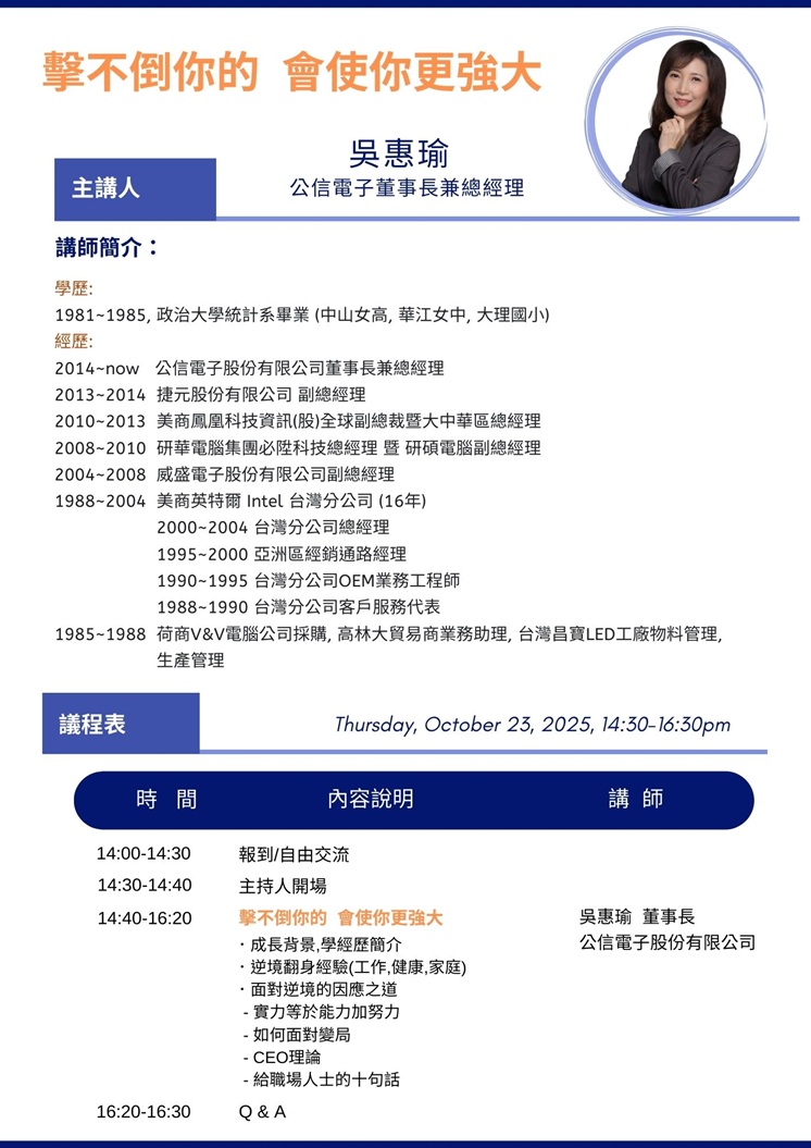 吳董事長將從自身成長背景與學經歷談起,並深度剖析她在工作、健康與家庭中所面對的各種挑戰,以及如何在逆境中堅定信念、突破困境,進而淬鍊出更堅強的力量。她亦將提出「實力=能力+努力」的核心觀點,闡述如何因應變局,並透過獨特的「CEO 理論」及十句精闢箴言,為職場人士帶來寶貴啟發。